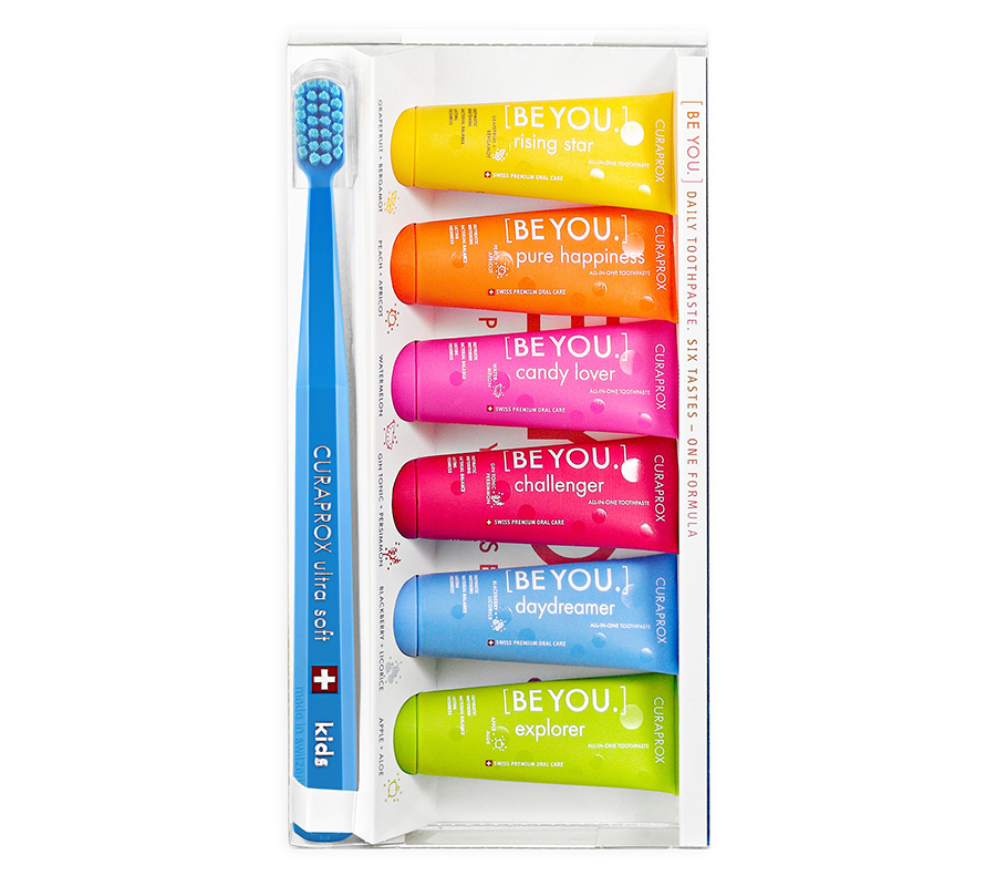 Набор CURAPROX Be you set, состоящий из шести семейных зубных паст Be you (10 мл) и зубной щётки CURAPROX CS Kids.