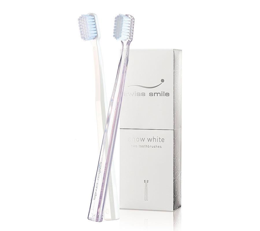 2 отбеливающие зубные щётки (цвета: прозрачный «transparent»/белый «white»). Очень густая щетина из ультратонкого волокна в центре щетки прекрасно очищает, а расположенная вокруг двухкомпонентная щетина для микрополировки, пропитанная раствором фторида натрия, придает зубам блеск и сияние.