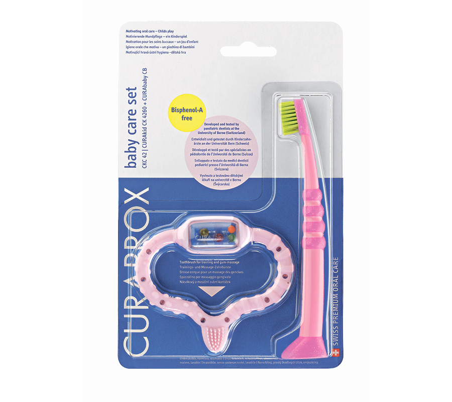 Стимулятор для прорезывания временных зубов, розовый (Curababy) в комплекте с детской зубной щеткой CURAPROX